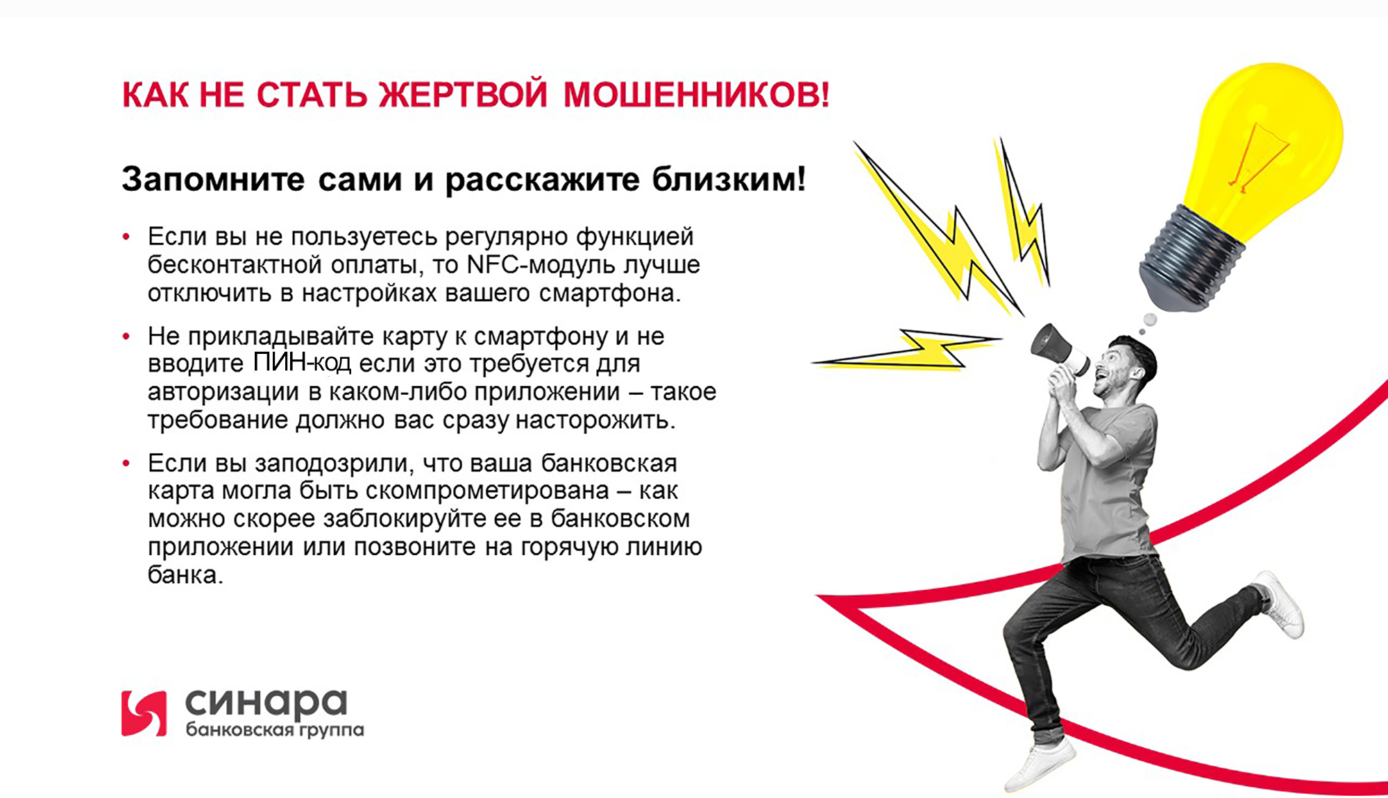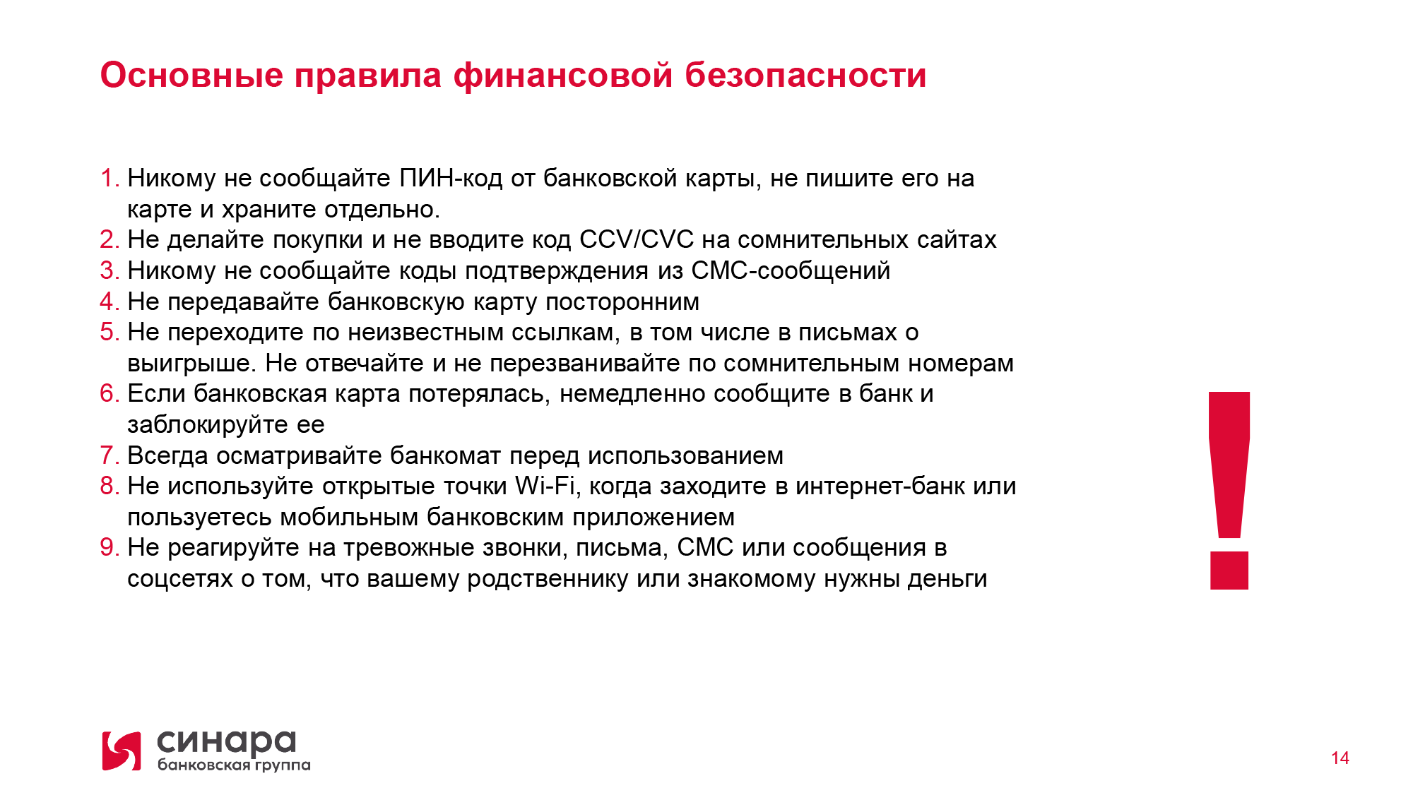 Не передавайте банковскую карту посторонним. Требуйте проведения операций с ней только в Вашем присутствии.